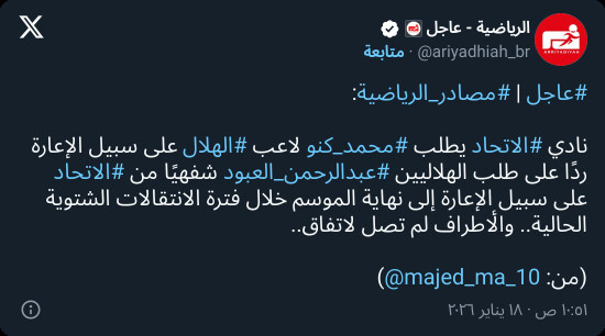 وفي مفاجأة لافتة، جاء رد إدارة الاتحاد مشروطًا بالحصول على خدمات لاعب وسط الهلال محمد كنو، ضمن صفقة تبادلية مباشرة بين الناديين، كخيار وحيد للنظر في التخلي عن العبود.