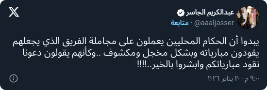 وفي هذا السياق، قال الجاسر في تعليق أثار جدلًا واسعًا: «يبدو أن بعض الحكام المحليين يجاملون الفريق الذي يطلب إدارتهم لمبارياته، وبشكل مخجل ومكشوف».