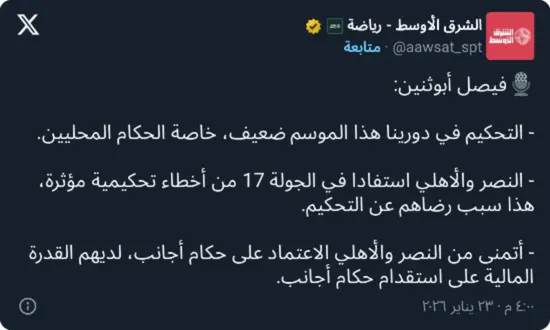 وفي هذا السياق، قال أبوثنين في تصريحات إعلامية: “التحكيم في دورينا هذا الموسم ضعيف، خصوصًا الحكام المحليين”.