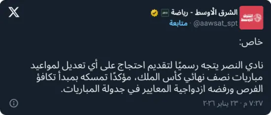 وأكدت المصادر ذاتها أن إدارة النصر تتجه رسميًا إلى تقديم احتجاج رسمي على أي تعديل محتمل لمواعيد مباراتي نصف نهائي كأس الملك، مشيرة إلى أن النادي سبق له التقدم بطلبات تأجيل في مواسم سابقة دون أن تتم الاستجابة لها، كان آخرها طلب تأجيل مواجهة النصر أمام الأهلي.