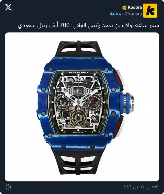 وتُعد هذه الساعة من الإصدارات النادرة عالميًا، إذ لا يتجاوز عدد القطع المنتجة منها 150 ساعة فقط، فيما يُقدَّر سعرها في السوق حاليًا بنحو 700 ألف ريال سعودي، مع توقعات بارتفاع قيمتها خلال الفترة المقبلة نظرًا لندرتها.