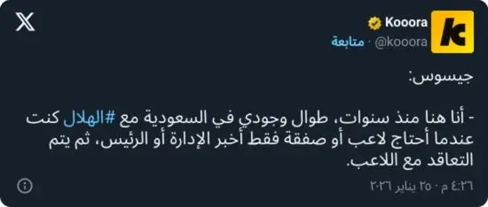 وعن مفاوضات الهلال مع عبدالله الحمدان، قال جيسوس: “الحمدان لاعب جيد، لكنني لا أريده في فريقي. أما حيدر عبدالكريم فهو لاعب صغير في السن، وأعتقد أن لديه مستقبل واعد مع النادي”.