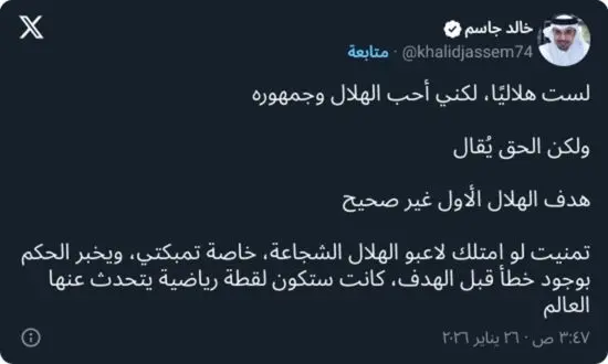وفي هذا السياق، كتب الإعلامي الرياضي خالد جاسم تدوينة عبر حسابه الشخصي قال فيها: “لست هلاليًا، لكني أحب الهلال وجمهوره، وأكثر ما يعجبني فيهم أنهم متصدرون وجمهورهم زعلان على التعادل، ولكن الحق يُقال”.