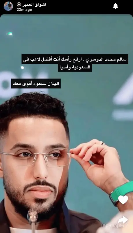 وفي هذا الإطار، شاركت أشواق العميرة تدوينة عبر حسابها الشخصي على منصة “سناب شات”، ردّت من خلالها على المشككين في قدرات سالم الدوسري، قائلة: “سالم محمد الدوسري، ارفع رأسك، فأنت أفضل لاعب في السعودية وآسيا”.
