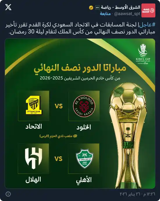 وأوضح الاتحاد السعودي لكرة القدم، في بيان رسمي، أن إدارة المسابقات طلبت مرئيات الأندية المتأهلة بشأن المواعيد المحددة سابقًا يومي 16 و17 مارس 2026، حيث جرى عرض روزنامة الموسم الرياضي كاملة أمام الأندية للاطلاع على الخيارات المتاحة، وذلك بالتنسيق مع رابطة الدوري السعودي للمحترفين والجهات ذات العلاقة.