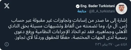 وأوضح أن الشخص المعني تجاوز كل حدود النقد، بعدما أساء للنادي الأهلي وجماهيره عبر أكثر من تغريدة في حسابه الشخصي، متضمنة عبارات جارحة وغير مقبولة، الأمر الذي دفع الرابطة لاتخاذ الإجراءات النظامية ورفع دعوى رسمية لدى الجهات المختصة.