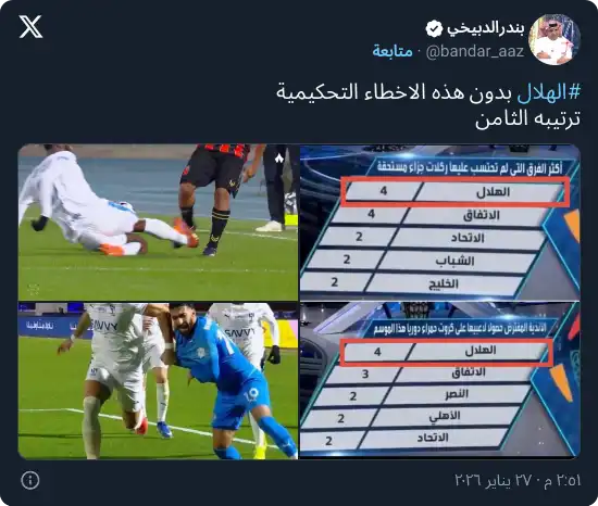 وكتب الدبيخي عبر حسابه الشخصي في تدوينة قال فيها: “الهلال بدون أخطاء تحكيمية سيكون مركزه هو الثامن”.