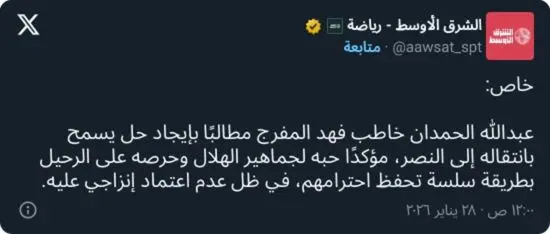 وفي هذا السياق، أفادت مصادر مطلعة بأن عبدالله الحمدان حرص على التواصل بشكل مباشر مع فهد المفرج، معبّرًا له عن تعلقه الكبير بجماهير الهلال، ومؤكدًا أنه لا يرغب في مغادرة النادي إلا بطريقة تحفظ له محبتهم وتقديرهم، مع تمنّيه إيجاد حل مناسب يتيح له الانتقال إلى النصر دون أن يترك أثرًا سلبيًا لدى أنصار “الزعيم”.