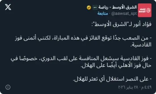 وفي هذا السياق، كشف نجم الشباب السابق فؤاد أنور عن أمنية مثيرة بشأن اللقاء، حيث قال في تصريحات إعلامية: “من الصعب جدًا توقع الفائز في هذه المباراة، لكنني أتمنى فوز القادسية”.