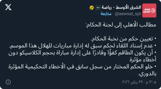 وفي هذا السياق، أوضح المركز الإعلامي للنادي الأهلي أن الخطاب المرسل للجنة الحكام تضمن طلبًا باختيار حكم من نخبة الحكام لإدارة اللقاء، على أن لا يكون قد سبق له إدارة أي مباراة لفريق الهلال خلال الموسم الجاري من الدوري السعودي للمحترفين.