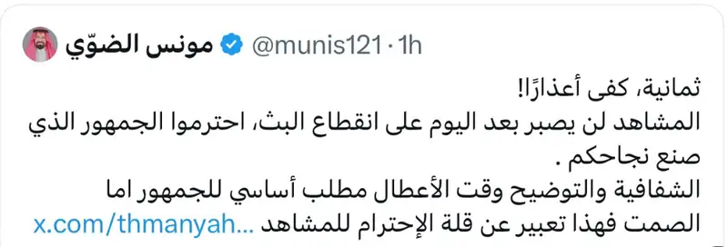 وتابع قائلاً: “المشاهد السعودي لم يعد قادرًا على الصبر على الانقطاعات المتكررة في بث قناتكم، احترموا الجمهور الذي منحكم هذه المكانة”.