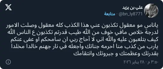 وتابع في تدوينة أخرى: «يا ناس مو معقول تكذبون عني هذا الكذب كله، معقول وصلت الأمور لدرجة ما في خوف من الله؟ طيب قدرتوا تكذبون على الناس، الله؟».