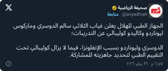 وأوضح الجهاز الطبي بنادي الهلال، في تقريره الرسمي، تعرض الثلاثي سالم الدوسري وماركوس ليوناردو وكاليدو كوليبالي لظروف صحية مختلفة، استدعت إخضاعهم لبرامج علاجية ومتابعة دقيقة خلال الأيام الماضية.