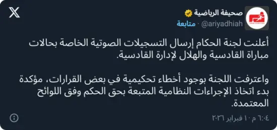 وأضافت اللجنة في ردها أنها باشرت اتخاذ الإجراءات النظامية المتبعة بحق الحكم، وفق اللوائح المعمول بها، مؤكدة التزامها بمراجعة الأداء التحكيمي بعد كل جولة، وحرصها على تطبيق أعلى معايير العدالة والشفافية، بما يضمن سلامة المنافسة وثقة الأندية والجماهير في منظومة التحكيم.