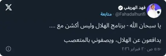 وكتب الهريفي عبر حسابه الشخصي تعليقًا ساخرًا قال فيه: “يا سبحان الله.. برنامج الهلال وليس أكشن”.
