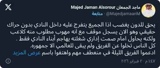 وأثار هذا الإخفاق حالة من الاستياء داخل أروقة النادي، شملت المدرب جورجي جيسوس وعددًا من لاعبي الفريق، يتقدمهم النجم البرتغالي كريستيانو رونالدو، إلى جانب شخصيات نصراوية سابقة، مثل فهد الهريفي وماجد الجمعان نفسه.