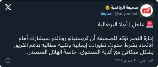 وفي هذا الإطار، أفادت صحيفة “أبولا” البرتغالية أن إدارة النصر أبلغتها بأن كريستيانو رونالدو مستعد للمشاركة خلال الفترة المقبلة، شريطة حدوث تطورات إيجابية تلبي مطالبه، وعلى رأسها دعم الفريق بصورة متكافئة مع أندية الصندوق الأخرى، خاصة الهلال متصدر الترتيب.