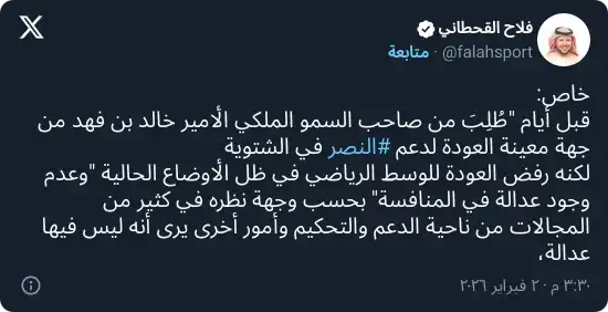 وقال القحطاني في توضيح عاجل: “صاحب السمو الملكي الأمير خالد بن فهد تلقى طلبًا رسميًا لدعم نادي النصر خلال فترة الانتقالات الشتوية، لكنه رفض ذلك بشكل قاطع”.