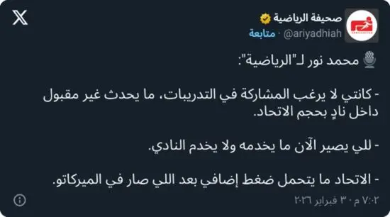 وأضاف نور: “إذا اللاعب ما عنده رغبة يكمل، لازم يكون واضح من البداية، الاتحاد ما يتحمل ضغط إضافي بعد اللي صار في الميركاتو، خصوصًا بعد خسارة أسماء مؤثرة”.