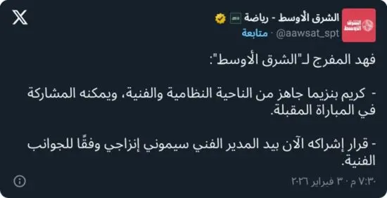 وأوضح المفرج أن بنزيما بات متاحًا من الناحية النظامية، عقب استكمال إجراءات تسجيله في القائمة، مؤكدًا أن اللاعب أصبح ضمن خيارات الفريق قبل المواجهة القادمة.
