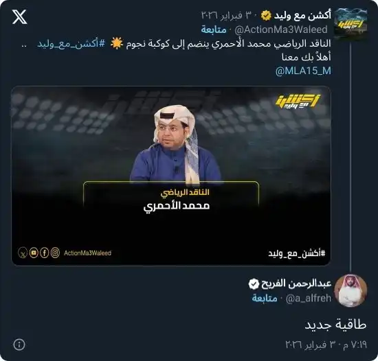 أعلن برنامج أكشن مع وليد عن ضم إعلامي جديد إلى قائمة ضيوفه الدائمين، في خطوة أثارت تفاعلًا واسعًا داخل الوسط الرياضي، تزامنًا مع استمرار البرنامج في استقطاب أسماء مثيرة للجدل ضمن حلقاته المتتالية.