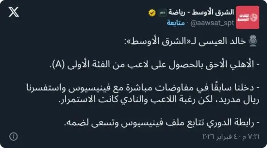 وأوضح العيسى أن الأهلي دخل في مفاوضات مباشرة مع فينيسيوس، كما جرى التواصل والاستفسار رسميًا مع ريال مدريد حول وضع اللاعب وإمكانية إتمام الصفقة، إلا أن الأمور لم تصل إلى مرحلة متقدمة.