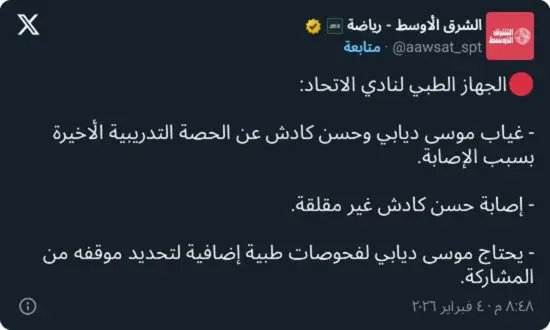 في المقابل، أكد الجهاز الطبي أن إصابة حسن كادش لا تُعد مقلقة مقارنة بإصابة ديابي، مشيرًا إلى أن اللاعب جاهز من الناحية الطبية، ويمتلك الضوء الأخضر للمشاركة في المباريات.