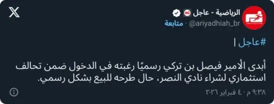 وجه الأمير فيصل بن تركي، رئيس نادي النصر السابق، رسالة إيجابية إلى جماهير “العالمي”، في توقيت حساس يمر به الفريق، على خلفية الأزمات والتحديات التي واجهها مؤخرًا، مؤكدًا ثقته بقدرة النصر على تجاوز المرحلة واستعادة استقراره.