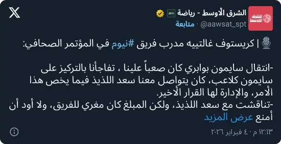 أصدر المركز الإعلامي لنادي الهلال تعليقًا رسميًا ردّ فيه على التصريحات التي أدلى بها الفرنسي كريستوف غالتييه، المدير الفني لفريق نيوم، بشأن كواليس انتقال اللاعب سايمون بوابري، وما تضمنته من إشارات تتعلق بدور الإدارة التنفيذية في الصفقة.