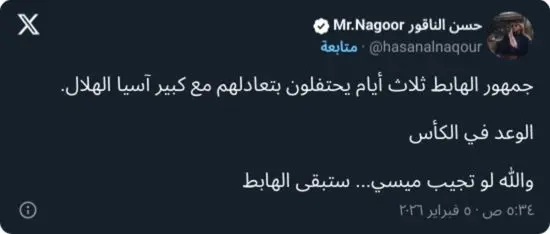 ولم يكتفِ الناقور بذلك، بل توعد بتفوق الهلال على الأهلي في نصف نهائي كأس خادم الحرمين الشريفين، مضيفًا: “الوعد في كأس الملك، والله لو تجيب ميسي ستبقى الهابط”.