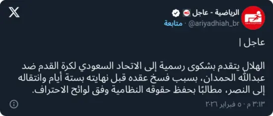 وطالب الهلال في شكواه بإثبات أن فسخ العقد تم دون سبب مشروع، إضافة إلى الحصول على تعويض مالي عن المدة المتبقية من العقد، وفق ما تقرّه اللوائح، مع الإشارة إلى أن انتقال اللاعب مباشرة إلى نادٍ منافس بعد الفسخ يُعد عنصرًا مؤثرًا في التقييم القانوني للقضية.