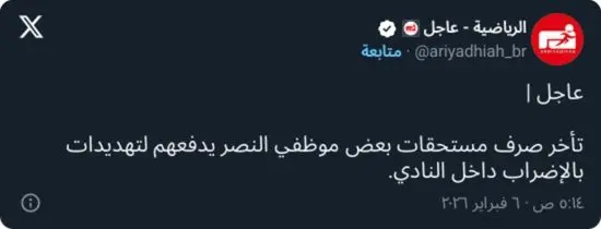 يواجه نادي النصر أزمة إدارية جديدة، بعد تأخر صرف مستحقات مالية تخص عددًا من موظفي النادي، في تطور لافت تجاوز الجوانب الفنية ووصل إلى ملفات تشغيلية تمس الاستقرار الداخلي للكيان.