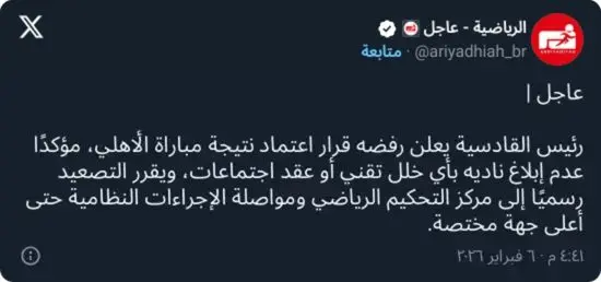 وجاء احتجاج القادسية بدعوى عدم نظامية تعديل قائمة الأهلي بعد انتهاء المهلة الرسمية، معتبرًا أن التغيير تم خارج الإطار الزمني المحدد، ما يُعد مخالفة صريحة للأنظمة، ويؤثر على عدالة المنافسة ونتيجة المباراة.
