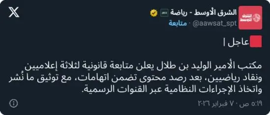ويُذكر أن خطوة الأمير الوليد بن طلال جاءت بعد مطالبات متزايدة من جماهير وإعلام نادي الهلال بضرورة التصدي لما وُصف بمحاولات التشكيك والإساءة، ووضع حد للاتهامات التي خرجت عن الإطار الرياضي والإعلامي المهني خلال الفترة الأخيرة.