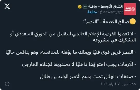 وجّه صالح النعيمة رسالة مباشرة إلى نادي النصر، مطالبًا إدارته باحتواء الأزمات الأخيرة التي يمر بها النادي، وعدم منح الفرصة لأي أطراف للتقليل من صورة الدوري السعودي على الصعيد العالمي.