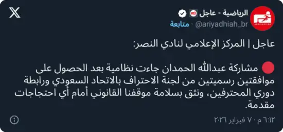 وشددت الإدارة النصراوية على أن مشاركة الحمدان تمت وفق اللوائح المعتمدة، وبعد اعتماد تسجيله رسميًا في النظام، مؤكدة احترامها الكامل للأنظمة والجهات المختصة، ورفضها أي تشكيك في نظامية الإجراءات المتخذة.