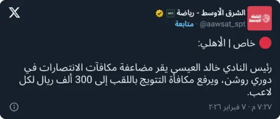 كما شمل قرار العيسى مضاعفة مكافأة التتويج بلقب الدوري، حيث كانت محددة سابقًا بـ 150 ألف ريال لكل لاعب، قبل أن يقرر رفعها إلى 300 ألف ريال في حال نجاح الفريق في تحقيق اللقب.