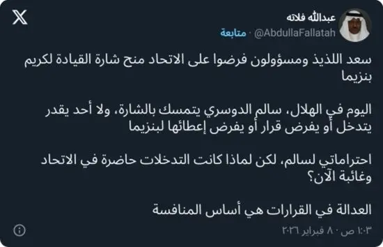 وفي هذا السياق، علّق الإعلامي الرياضي عبدالله فلاته على المشهد، معبرًا عن استيائه مما وصفه بازدواجية المعايير، مشيرًا إلى أن بنزيما، عند قدومه إلى الاتحاد، مُنح شارة القيادة رغم وجود قائد للفريق آنذاك، في حين لم يتدخل أي طرف مماثل لفرض سيناريو مشابه داخل الهلال، الذي واصل الاعتماد على سالم الدوسري كقائد للفريق.