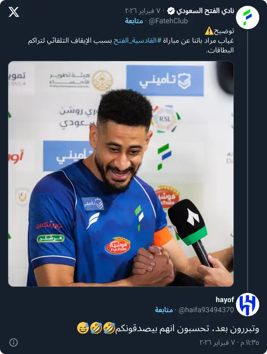 وفي هذا السياق، نشر نادي الفتح توضيحًا رسميًا عبر حسابه على منصة “إكس”، أكد فيه أن غياب مراد باتنا جاء بسبب الإيقاف نتيجة تراكم البطاقات الصفراء، وليس لأي أسباب فنية أو قرارات خاصة بالمباراة المقبلة.