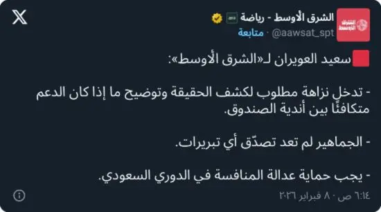 واختتم العويران حديثه بالتأكيد على أن مطالبته لا تستهدف ناديًا بعينه، بقدر ما تعكس حالة احتقان جماهيري عامة، داعيًا إلى كشف الحقائق بشكل رسمي يضع حدًا للجدل، ويحفظ ثقة الشارع الرياضي بعدالة المنافسة داخل الدوري السعودي.