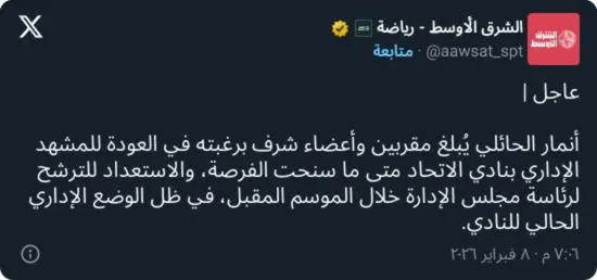 وفي هذا السياق، أكدت مصادر مطلعة أن الحائلي أبدى استياءه من الوضع الإداري الحالي، حيث أبلغ مقربين منه، إلى جانب بعض أعضاء الشرف، برغبته في العودة إلى المشهد الإداري الاتحادي متى ما سنحت الفرصة، مع إعلانه نيته الترشح لرئاسة مجلس إدارة النادي خلال الموسم المقبل.