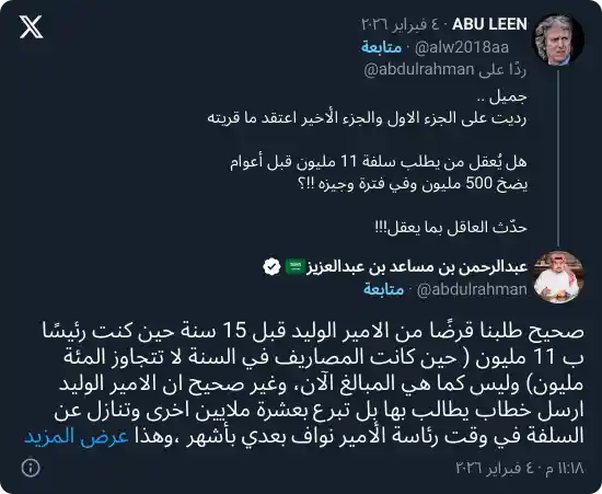 ونفى بن مساعد صحة ما تردد عن مطالبة الأمير الوليد باسترداد المبلغ، مشيرًا إلى أن الأخير تبرع لاحقًا بمبلغ 10 ملايين ريال إضافية، وتنازل عن القرض بالكامل خلال رئاسة الأمير نواف بن فيصل.
