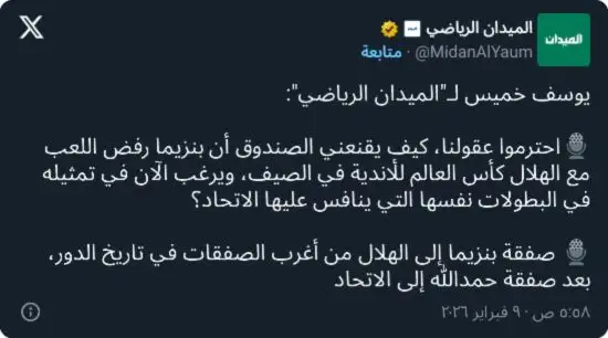 وفي هذا السياق، كتب خميس عبر حسابه الشخصي تعليقًا تساءل فيه عن منطق الصفقة، قائلًا: «احترموا عقولنا، كيف يقنعني صندوق الاستثمارات أن كريم بنزيما رفض اللعب مع الهلال كأس العالم للأندية في الصيف، ويرغب الآن في تمثيله في البطولات نفسها التي ينافس عليها الاتحاد؟».