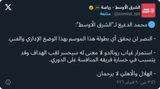 وفي هذا السياق، حذّر الدعيع من انعكاسات استمرار الوضع الراهن، مؤكدًا أن الفريق مهدد بخسارة سباق الدوري إذا تواصل الغياب الإداري والفني عن المشهد، إلى جانب استمرار غياب النجم البرتغالي كريستيانو رونالدو عن المباريات.