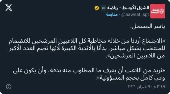 وأوضح المسحل أن الاجتماع جاء ضمن خطة واضحة للتواصل المباشر مع اللاعبين المرشحين لتمثيل المنتخب السعودي، مشددًا على أهمية هذه المرحلة في مسار الإعداد، بعيدًا عن أي اجتهادات فردية أو رسائل غير مباشرة.