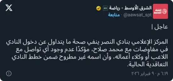 وفي هذا السياق، نفى المركز الإعلامي بنادي النصر بشكل قاطع صحة ما يتم تداوله، مؤكدًا أن النادي لم يدخل في أي مفاوضات مع محمد صلاح، ولم يجر أي تواصل رسمي أو غير رسمي مع اللاعب أو وكلاء أعماله، مشددًا على أن اسمه غير مطروح ضمن خطط النادي التعاقدية في الفترة الحالية.