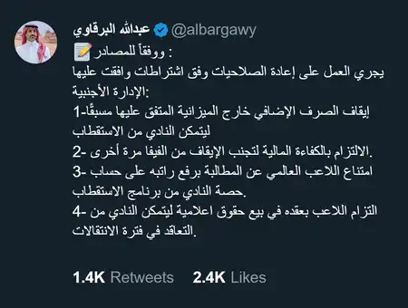 وأوضح النصر في شكواه أن التغريدة تضمنت طرحًا عامًا بصيغة «وفقًا للمصادر» دون نسب واضح أو تحديد لمصدر رسمي، واشتملت على معلومات غير دقيقة ومجتزأة، جرى تقديمها بطريقة أثارت الجدل بين الجماهير، وأعطت انطباعات خاطئة.