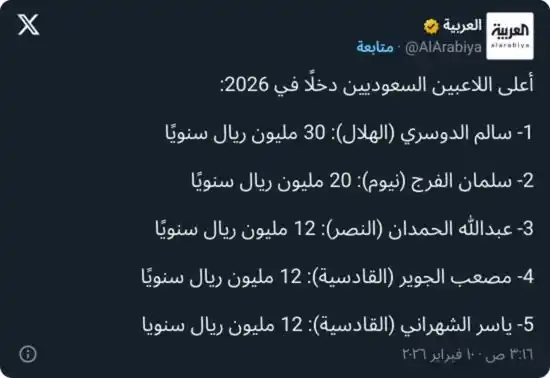 وحل سلمان الفرج لاعب نيوم في المركز الثاني بدخل سنوي يقارب 20 مليون ريال، مستفيدًا من خبرته الطويلة وقيمته الفنية، فيما جاء عبدالله الحمدان لاعب النصر ثالثًا براتب سنوي يبلغ 12 مليون ريال.