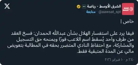 تلقّى نادي الهلال ردًا رسميًا من الاتحاد الدولي لكرة القدم، بشأن الاستفسار الذي تقدّم به النادي حول أحقية مشاركة لاعبه السابق عبدالله الحمدان مع نادي النصر، عقب فسخ عقده قبل نهايته بأيام قليلة خلال فترة الانتقالات الشتوية.