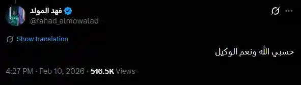وخلال الساعات الأخيرة، زادت وتيرة الجدل بعد تداول تصريح للمواطنة الإماراتية قالت فيه إن الحادثة «غير طبيعية» وطالبت بإجراء تحقيق شامل، وهو ما تفاعل معه محيط اللاعب، حيث رد شقيق فهد المولد عبر حسابه على منصة «إكس» بعبارة: «حسبنا الله ونعم الوكيل»، دون تأكيد أو نفي مباشر لما ورد في التصريح المتداول.